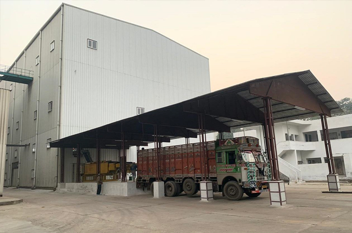 The first of its kind in a flour mill, bags are loaded using a telescopic truck loader. The packed bags are transported to the truck loader using conveyer belts. The truck loader automatically loads the truck.